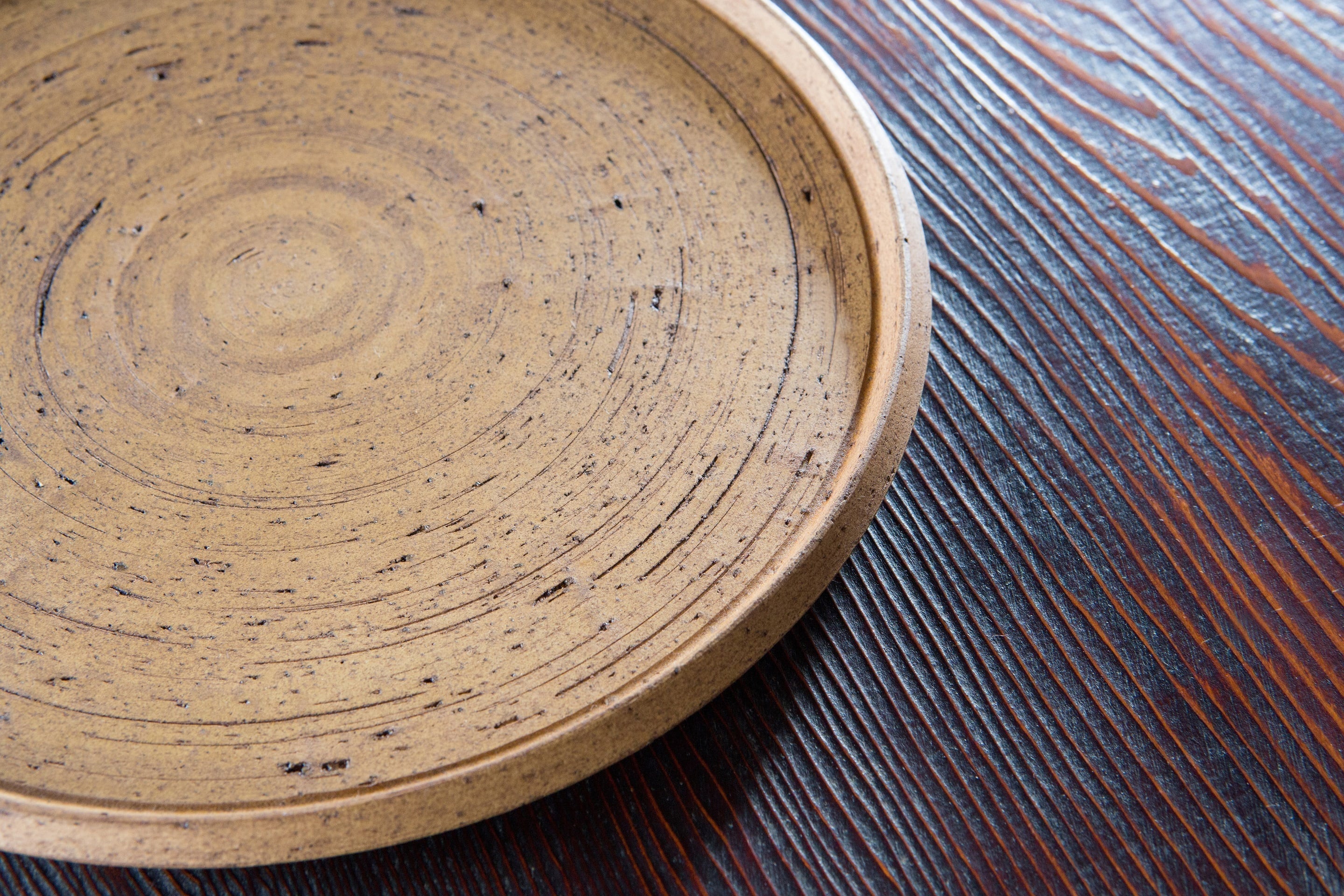 荒々しい土肌は年輪の様な風合いで陶器ではないかの様な質感です。大地の色である茶色は食材にマッチし、自然を表現するのによいアイテムになると考えています。